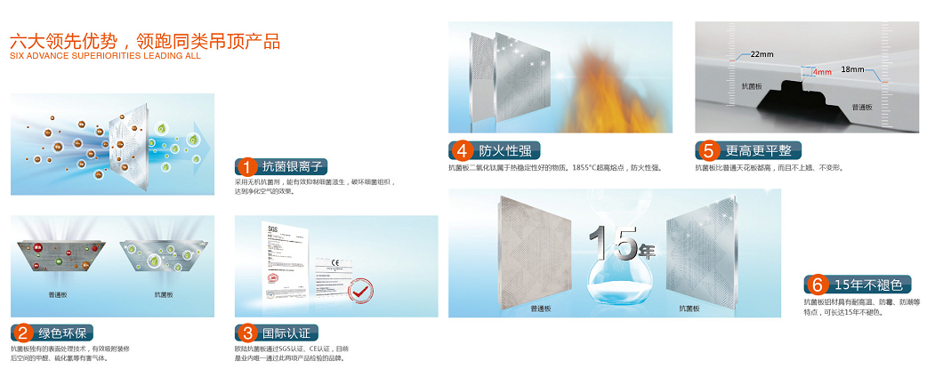 此外,欧陆美居抗菌吊顶的抗菌板经过表面特殊处理,能有效吸附有效吸附装修后的甲醛、硫化氢等有害气体,具备绿色环保的特点,更通过了ISO9001认证、中科院认证、SGS安规认证等众多国际检测,产品安全、质量过硬,抗菌效力高达10年以上。