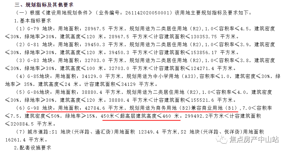 第三项新记录是建筑的较大高度。据地块规划指标及其他要求,G-98 地块规划用途为商务用地,将建设不高于460米的超高层建筑,成为中山东部的新地标。