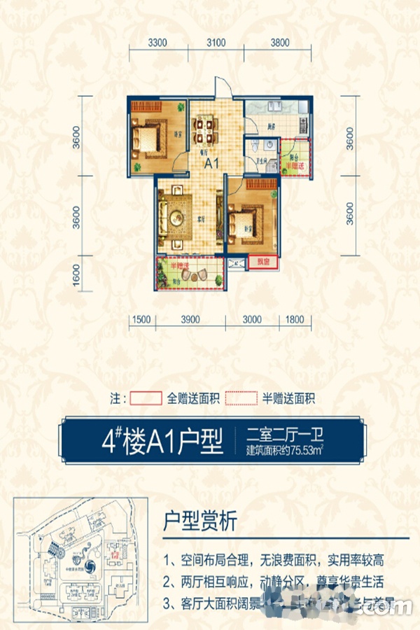 2室2厅1卫-4#楼A1户型 二室二厅一卫 75.53㎡