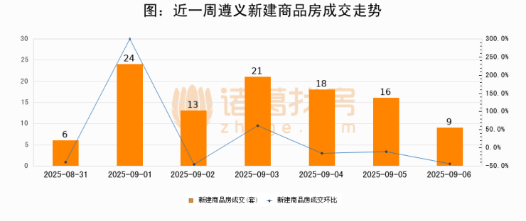 根据遵义市住房和城乡建设局数据显示,2025年09月06日遵义新建商品房成交9套,较昨日减少7套,环比下降43.8%。近一周遵义新建商品房日均成交16套。09月06日单日成交9套,低于近一周平均水平43.8%。