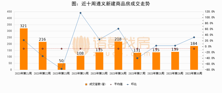 进入2025年第30周(07月21日-07月27日),遵义新建商品房成交184套,较上周增加45套,环比上涨32.4%。从近十周成交来看,周均成交套数为163套,本周成交184套,高于近十周平均成交量12.9%。