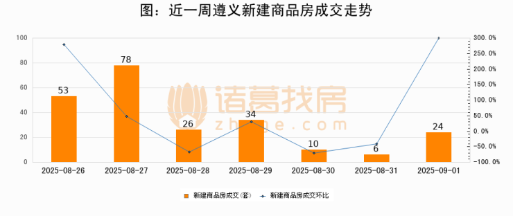 根据遵义市住房和城乡建设局数据显示,2025年09月01日遵义新建商品房成交24套,较昨日增加18套,环比上涨300%。近一周遵义新建商品房日均成交33套。09月01日单日成交24套,低于近一周平均水平27.3%。