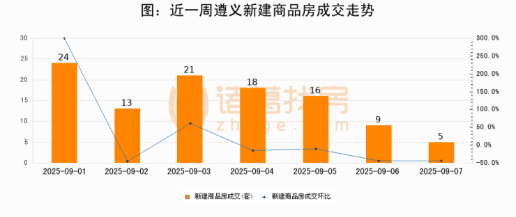 根据遵义市住房和城乡建设局数据显示,2025年09月07日遵义新建商品房成交5套,较昨日减少4套,环比下降44.4%。近一周遵义新建商品房日均成交16套。09月07日单日成交5套,低于近一周平均水平68.8%。