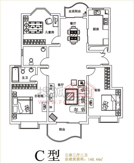 3室2厅2卫-兴东龙腾盛世 C型三房两厅两卫 146.44㎡