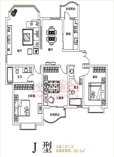 3室2厅2卫-兴东龙腾盛世 J型三房两厅两卫 155.31㎡