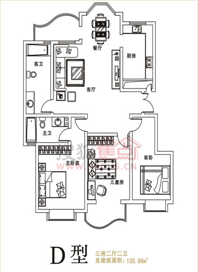 3室2厅2卫-兴东龙腾盛世 D型三房两厅两卫 135.86㎡