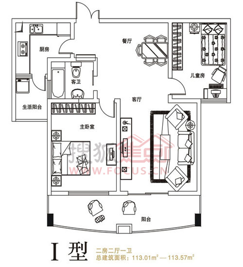 2室2厅1卫-兴东龙腾盛世 I型两房两厅一卫 113.01-113.57㎡