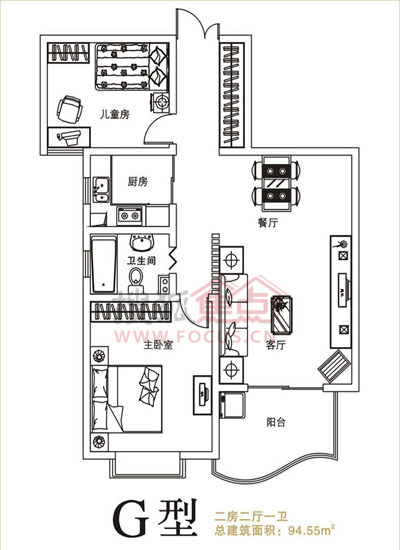 2室2厅1卫-兴东龙腾盛世 G型两房两厅一卫 94.55㎡