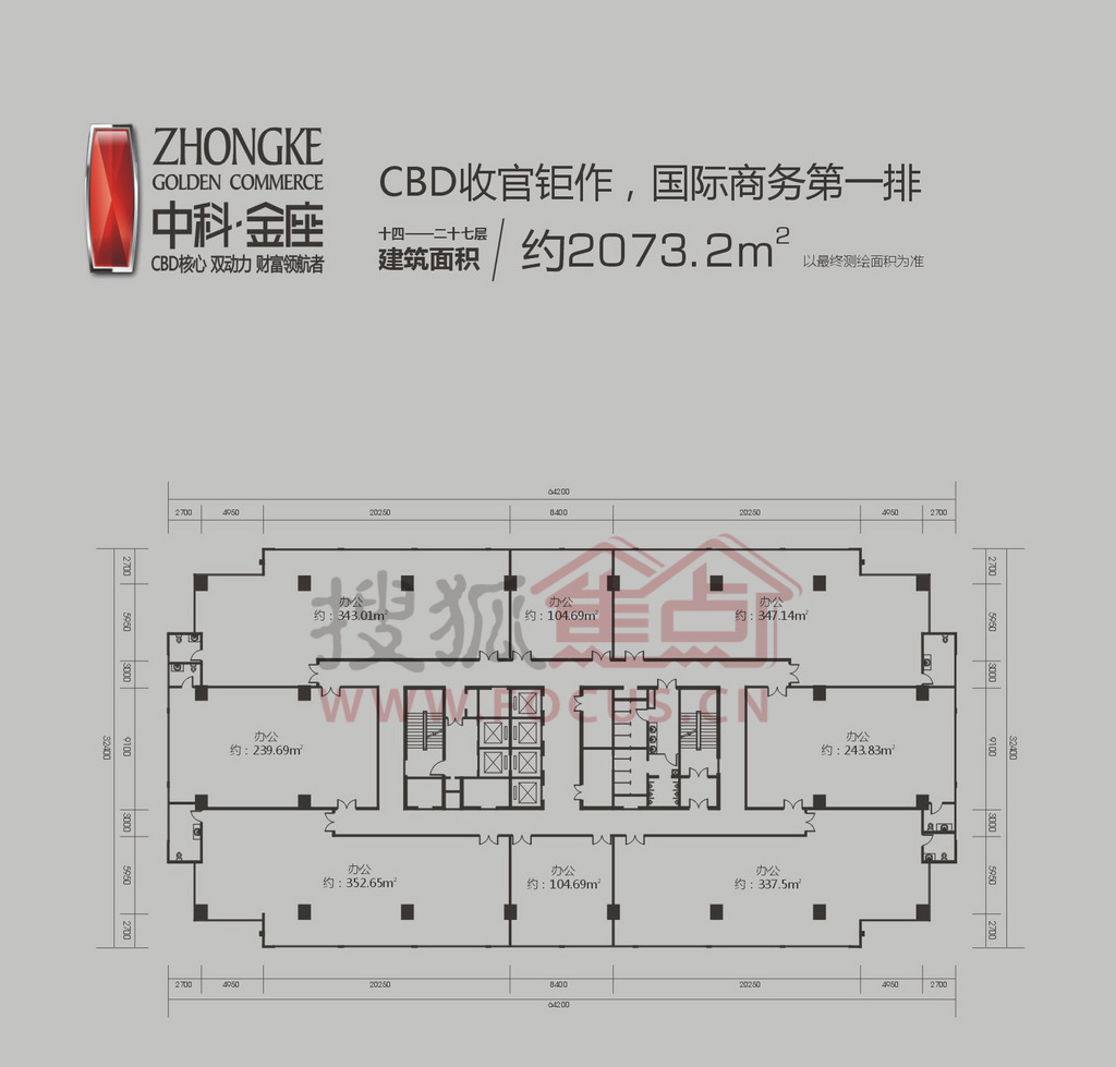 项目建筑结构为框架结构,地上31层,地下3层。项目总建筑面积7.5万㎡,其中地上建筑面积6.5万㎡。中科•金座主体高120米。地上建筑1层-6层为商业群房,以银行,咖啡厅,大型多功能厅,中型会议室为;6层-31层为高档写字楼,标准层十部电梯。顶部设屋面直升机停机坪。