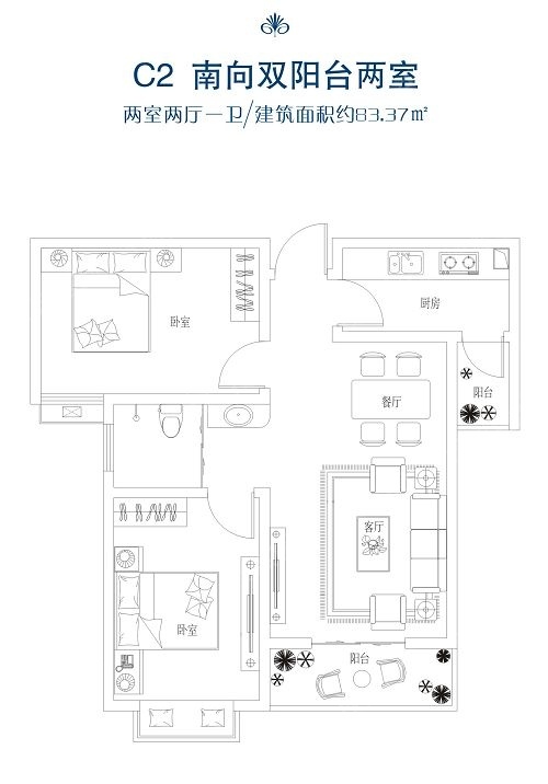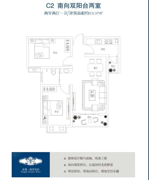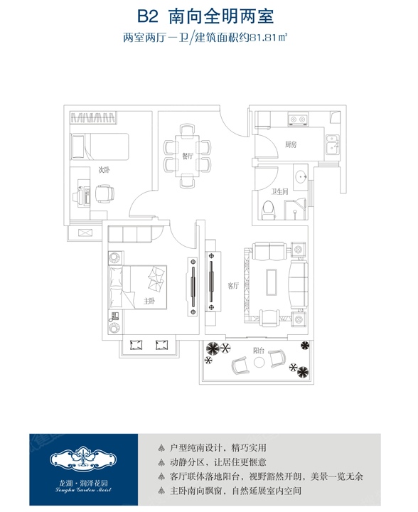 2室2厅1卫-龙湖润泽花园南向全明两室户型图