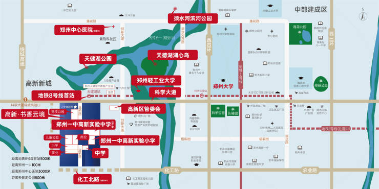 踞守城市主干道科学大道,坐享城市交通红利。地铁8号线首站天健湖站距离项目约500米(直线距离);预计2024年年底开通,8号线一路向东直达白沙绿博,串联起郑州多家商业、医院、景点。