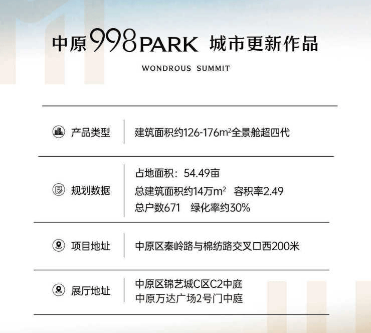 项目踞守西三环内中原 998PARK 核心,以2.49低容积率、超四代“6S”全景舱产品、7 大公园环伺的优势,精准匹配高净值人群对 “主城理想家” 的期待。