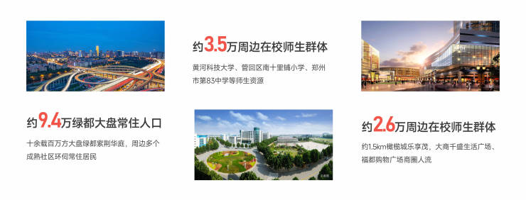 百万方大城绿都紫荆华庭和澜湾,海量常住人口;一路之隔黄河科技学院,近邻管回区南十里铺小学、第83中学等多所学校,家长陪读/师生租住优选