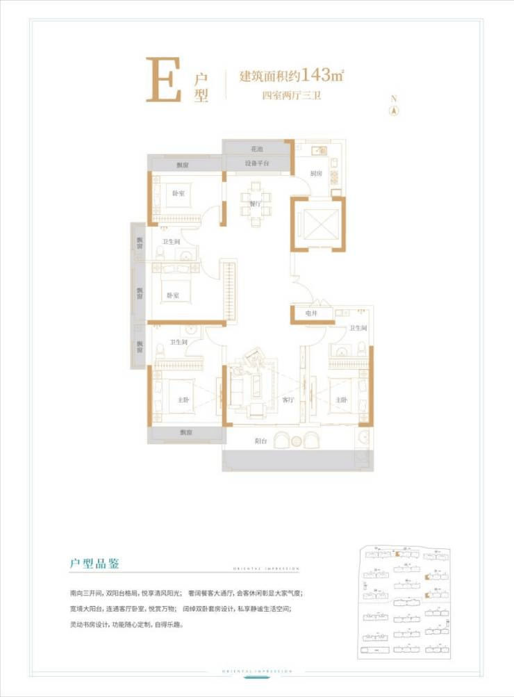 143㎡四室两厅三卫:南向三开间 + 双阳台,餐客大通厅显气派,双卧套房设计(主卧带独立衣帽间),灵动书房可定制,满足三代同堂的居住需求。