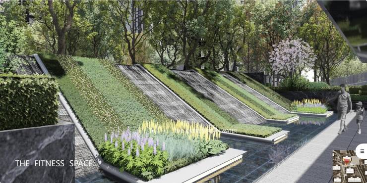 以大地景观艺术规制专属归家林荫大道;以中央架空层与庭院式会客厅营建近10000㎡中央会客园林,同时构筑约1400㎡架空会客厅;以鹅掌楸、银杏、乌桕、青桐建造四大风景林;以银杏林间6座景观桥串联6大主题游乐场地