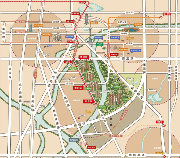 黄金三角区位:项目地处郑州 “东强”、“中优”、“南动” 三大城市功能布局的黄金三角区,能有效承接多区域的资源辐射与政策红利,是城市未来发展的重点承载地。