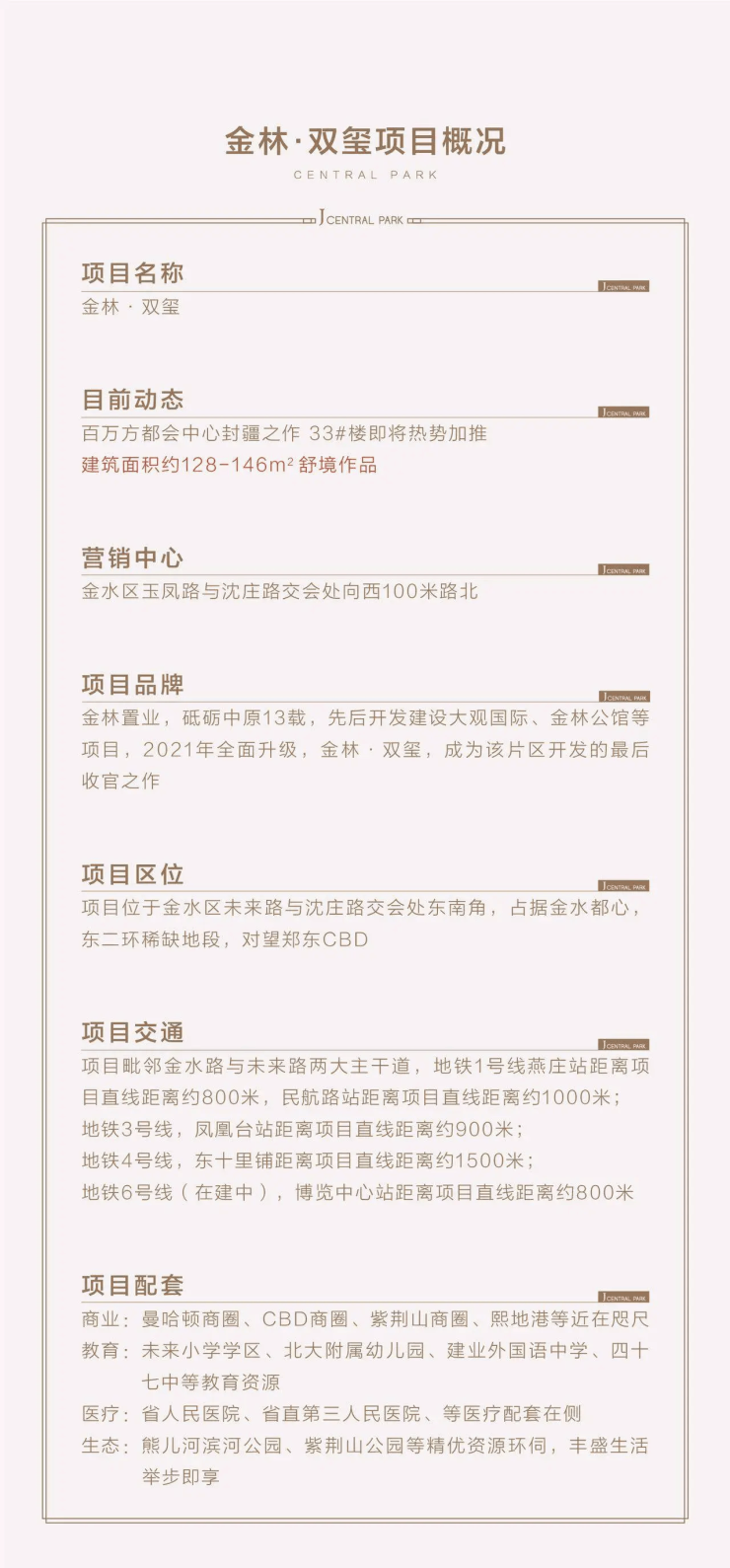 金林双玺雄踞郑州金水区东二环黄金地段,位于未来路与沈庄路交汇处,是区域内绝版的纯改善品质住区。项目隶属于繁华的曼哈顿商圈,坐享地铁与成熟商业配套,自身为即买即住的实景现房。项目以建面约128-146㎡的舒境住宅,为城市菁英提供一处占据城芯、生活便捷的品质居所。