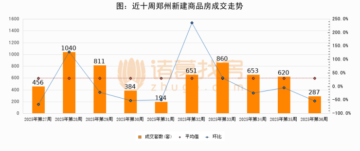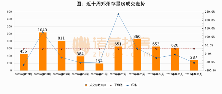 进入2025年第36周(09月01日-09月07日),郑州新建商品房成交287套,较上周减少333套,环比下降53.7%。从近十周成交来看,周均成交套数为595套,本周成交287套,低于近十周平均成交量51.8%。
