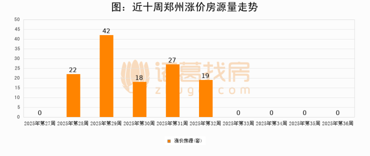 从调价房源来看,第36周郑州涨价房源0套,较上周持平。与此同时,36周涨价房源占比持平