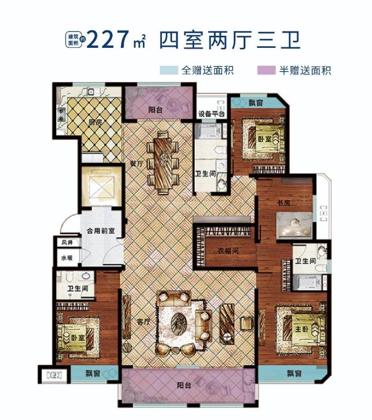 户型解析:小高层227㎡奢阔四房,大客厅,大主卧,观景阳台,南北通透户型肆意挥洒清风与阳光,方正空间尽显卓尔不群的贵族风范,自在生活。