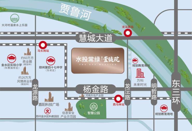 2、项目近邻贾鲁河畔,紧邻慧城明渠(规划中),贾鲁河湿地公园、明渠市政公园、智慧公园,优质生态鲜氧浸润,成就全家人的养生日常。