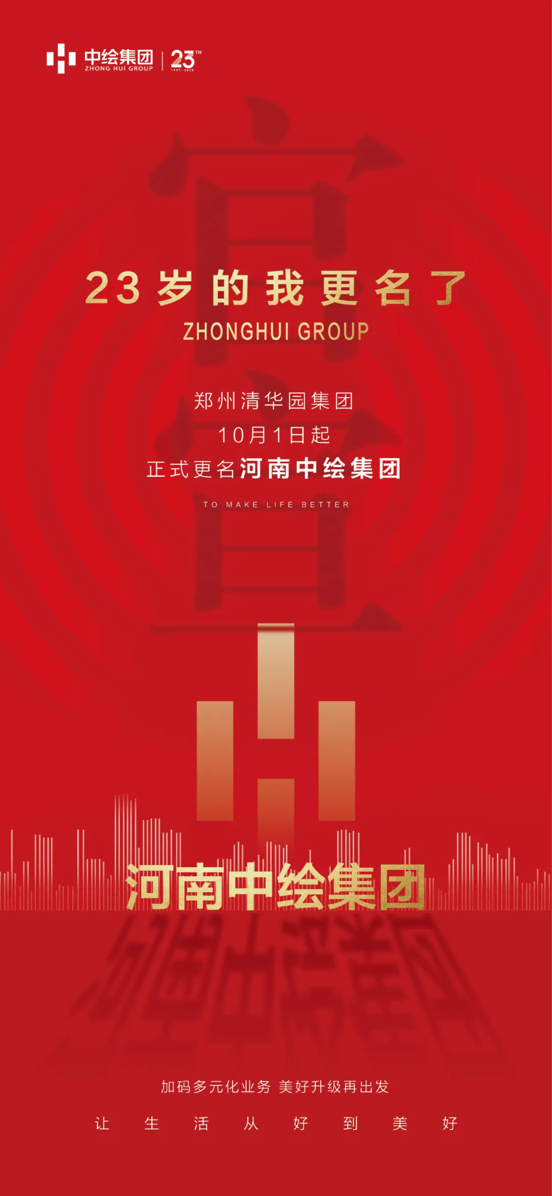 “惟进取也,故日新”,过往的成绩给予了中绘集团自信和从容,新的使命也将引领中绘集团踏上焕新的历程。未来,中绘集团将在“城市建设者”的基础上,继续叠加升级到“城市生活服务运营商”的新角色,持续优化多元业务,在 “深耕中原”战略布局的同时,稳步拓展全国版图,不断提高产品研发、品质管控能力,开发出更多高品质项目,为城市和生活在城市的人们,带来更多的价值与美好。中绘集团 扬帆起航所有的光芒都需要时间才看到但“让生活从好到美好”的企业愿景每一天都在中绘人的努力下悄然发生一个新的名字,即是一个新的使命二十三年的光阴积淀踏着时代的脉搏,不断洞察生活的真谛中绘集团,终将被城市深深记住