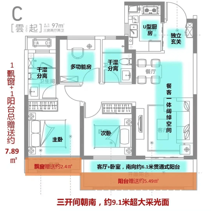 户型共性:所有户型均追求南北通透、双明卫设计,并拥有约8.08-8.8㎡的超大赠送面积及落地窗,得房率高,采光视野俱佳。
