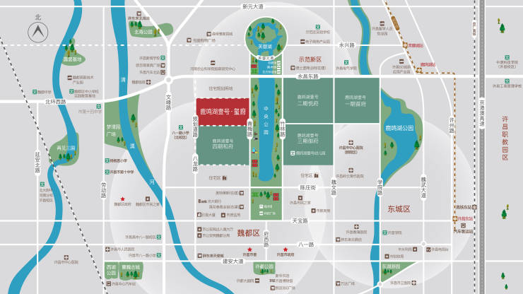 一轴连双城,南北四节点,许昌发展东移北上,城市中轴涵盖中央政务区(CGD)、中央生活区(CLD)、中央商务区(CBD),项目位居中央公园首排,鼎立城市中芯。