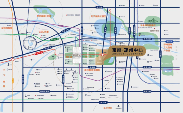 宝能·郑州中心居高铁中央商务核心区,东临明理路,南临商鼎路,北至七里河南路,高铁、地铁(1号线博学路站、5号线在建中、8号线规划中)轻轨三铁合一,直达机场。