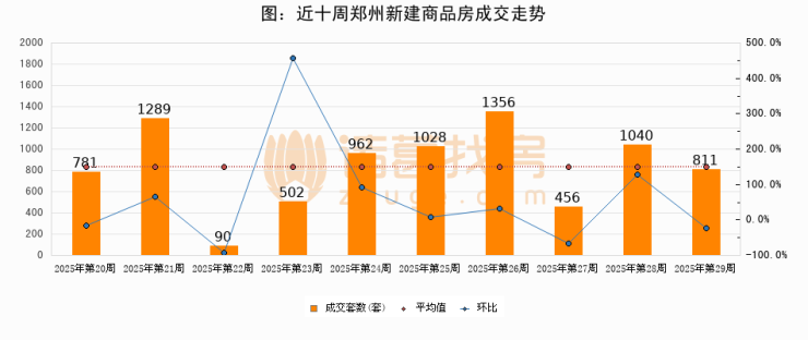存量房方面,第29周郑州存量房成交811套,较上周减少229套,环比下降22%。从近十周成交走势来看,周均成交套数为1013套,本周低于平均水平19.9%。
