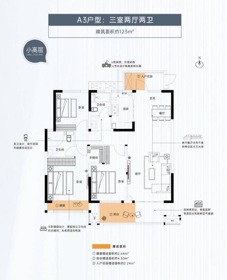 6、82%超高得房率(对比市场高层100㎡户型,使用面积多7-8㎡)