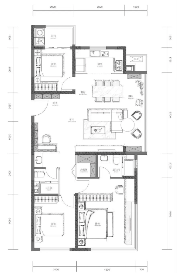 此户型是洋房产品的代表,规划为四房三卫。通常享有更优的梯户比、更高的得房率及更静谧的社区位置。其奢阔的尺度、完备的套房设计,旨在满足塔尖改善家庭对空间、私密、舒适与身份的全面高阶要求。