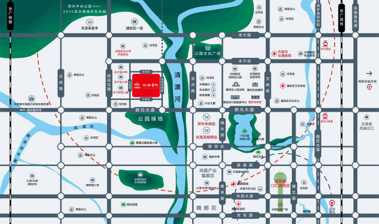 东门即是清潩河河景公园,身处景观阳台,即可一览清潩河美丽河景;沿河两侧还设有足球场、篮球场等运动场地,下午运动健身,傍晚沿清潩河畔遛弯散步,清风吹拂,落日余晖照影河面,心情愉悦慢享生活;从项目东门出发,步行十分钟即可到达北海公园,是餐后散步、周末放松的绝佳去处。除此之外,项目周边还有郑许中央公园,三国文化广场、周庄水乡等,充分满足您的休闲娱乐需求。