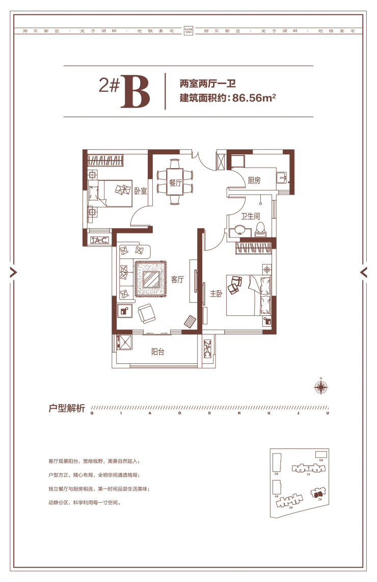 建面约86㎡/90㎡户型 (两房):此类户型格局紧凑,功能分区明确,是刚需家庭或投资置业的优质选择,能够以相对经济的总价入住郑东核心区。