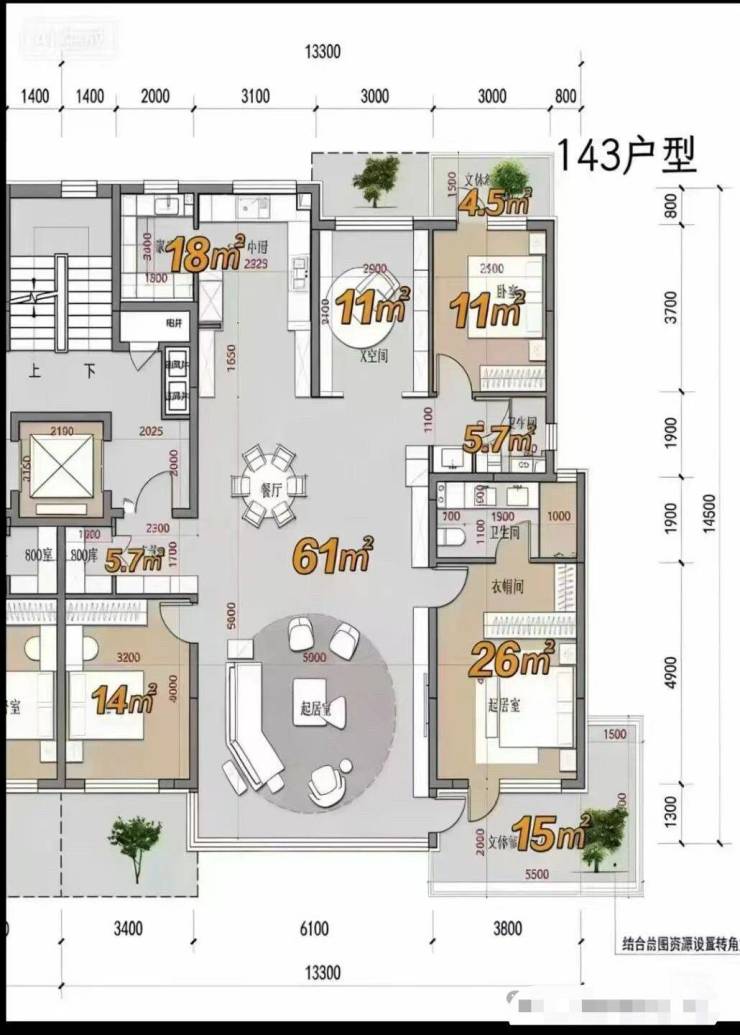 最惊喜的是得房率:143 平四室能做到 115% 左右,实际使用面积比同面积高层多近 20 平。