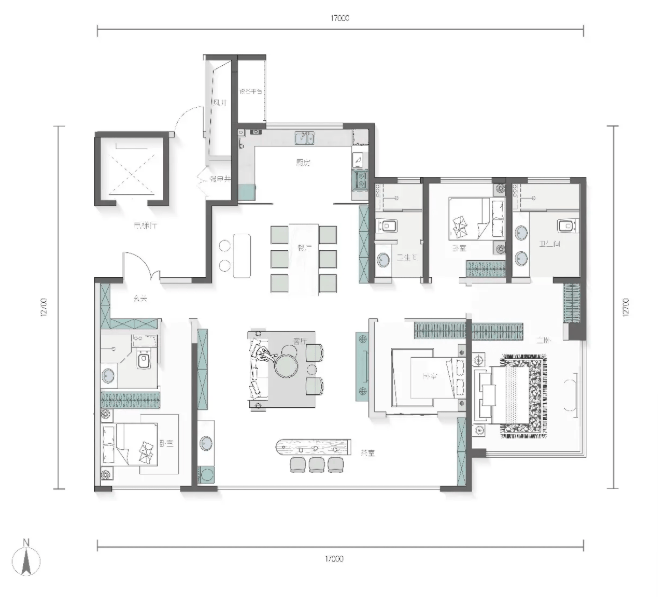 此户型在人居美学上更进一步,厅堂面宽达6.2米,空间尺度更为奢阔,满足多口之家对雅致生活的进阶需求。