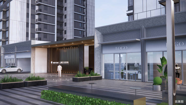 4、唯此铝板幕墙 高光奢石立面——公建化外立面, 钻感LOW-E玻璃幕墙+经典金属铝板+“全面屏”窗墙比+蓝眼睛花岗岩设计