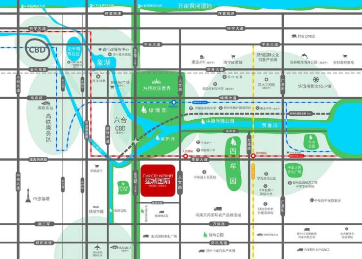 方特欢乐世界、建业电影小镇、海昌极地海洋馆、郑汴中央公园、绿博园、圃田泽(项目对面,占地800亩)